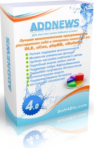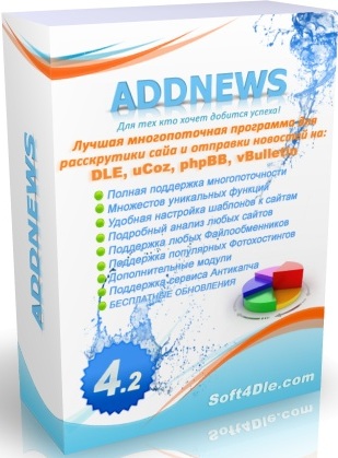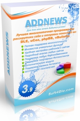 ![]() АддНьюс, AddNews 3.9 - это многопоточный софт, который предназначается для добавления новостей на варезные порталы, сделанные на самых известных движках vBulletin, DLE, UCOZ и PHPBB. |