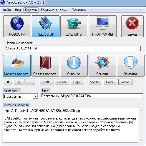 ![]() АвтоШаблон AG 2.7.1 - поразительная программа которая способна в несколько раз ускорить и облегчить ручное добавление постов с ссылками для скачивания файлов и картинками на абсолютно любые сайты. Маленькая программка просто необходима для облегчения ручного добавления новости на сайт. В связи с тем, что на различных сайтах совершенно разные правила оформления новостей, то к каждому из них приходится составлять персональные шаблоны. А на это уходит очень много времени. Так вот данная программа автоматически готовит шаблоны. Вы должны всего лишь один раз написать новость и заполнить все необходимые поля в программке. ![]() ![]() Преимущества программы АвтоШаблон AG: 1) Наличие расширенного конструктора шаблонов, в нём можно настроить порядка тридцати разнообразных параметров и получить шаблон с максимальной точностью для всех сайтов из своей базы; 2) Лёгкое управление. Чтобы подготовить новость для публикации не нужно применять никаких переменных. Заполните все текстовые поля (название новости, ключевые слова, краткое описание, полное описание, информация о файле и ссылки) и сразу начинайте публиковать; 3) Программа АвтоШаблон AG максимально ускоряет процесс ручной публикации новостей, так как она быстро генерирует необходимый шаблон для сайтов, позволяет использовать горячие кнопки для моментального копирования кода новости в буфер обмена, определяет путь добавления новостей что позволяет значительно уменьшить количество переходов по сайтам и много чего ещё; 4) Проверка ссылок на работоспособность; 5) Автоматическое добавление недостающие пробелов после точек, запятых и других знаков препинания, а так же до и после скобок; 6) АвтоШаблон AG делает ручной постинг быстрым, удобным и качественным. Принцип работы программы: 1) Включаем программу и нажимаем на кнопку "Создать Новую Новость". (Затем все Ваши новости будут сами автоматически сохраняться, и всегда будут находиться во вкладке "Мои Новости"). 2) Начинаем составлять свою новость. Заполняем все необходимые текстовые поля: название, теги, краткую и полную новость, информацию о файле и ссылки. Если хотите, то можете добавить заметки. (Новость необходимо составить всего лишь раз. Если не получается правильно заполнить поля для текста, то просто нажмите на любую кнопку с примерами оформления, их шесть: фильмы, видео ролики, большие игры, мини игры, программы, музыка. Затем изменяем новость, так как Вы хотите. Внимание! ссылки на картинки и файлообменники добавляем без тегов, так как они вставятся сами при получении шаблона). 3) Далее переходим во вкладку "Шаблоны" и выбираем любой из них. 4) В программу совершенно спокойно можно добавлять любые сайты и настроить их с помощью "Конструктора Шаблонов". (Если у Вас нету специальных программ для автоматического постинга новостей или есть сайты, на которых публиковаться можно только в ручную, то просто добавляйте свои любимые сайтики в базу). Внимание!!! Если вы первый раз запустили данную программу, то в обязательном порядке перед подготовкой новости читайте инструкцию и смотрите видео урки. Что нового в версии 2.7: 1) Усовершенствована таблица со списком сайтов из базы; 2) В процессе публикации новостей, напротив сайтов будут появляться зелёные или красные значки. Теперь вы будите знать, на каких сайтах опубликовали свою новость, а также каки